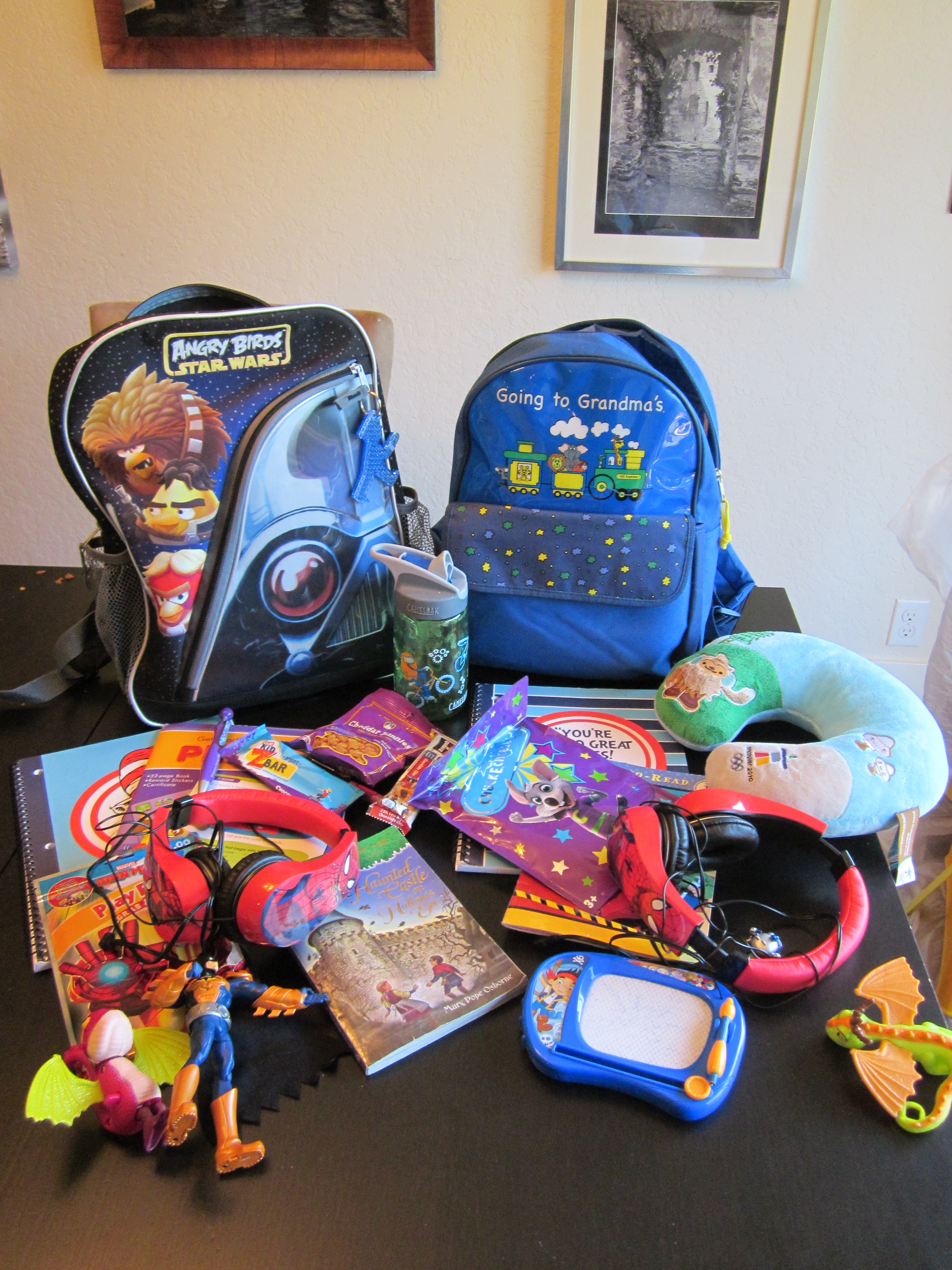 Next came filling the backpacks.  Mine included my neck pillow, diapers and wipes for the trip, baby food and snacks for the little one, my camera, my travel binder and some notebooks, my travel documents, and my Ergo for the plane (often you don’t get your stroller back at the plane door when you land so the Ergo is great for getting off the plane with baby while managing the other kids and bags.)  For the boys they each got a screen device (once chose the iPad while the other got a Kindle Fire), their headphones for the tv, some reading books, an activity set/coloring book, two small toys, snacks and their journals.  It looked something like this…