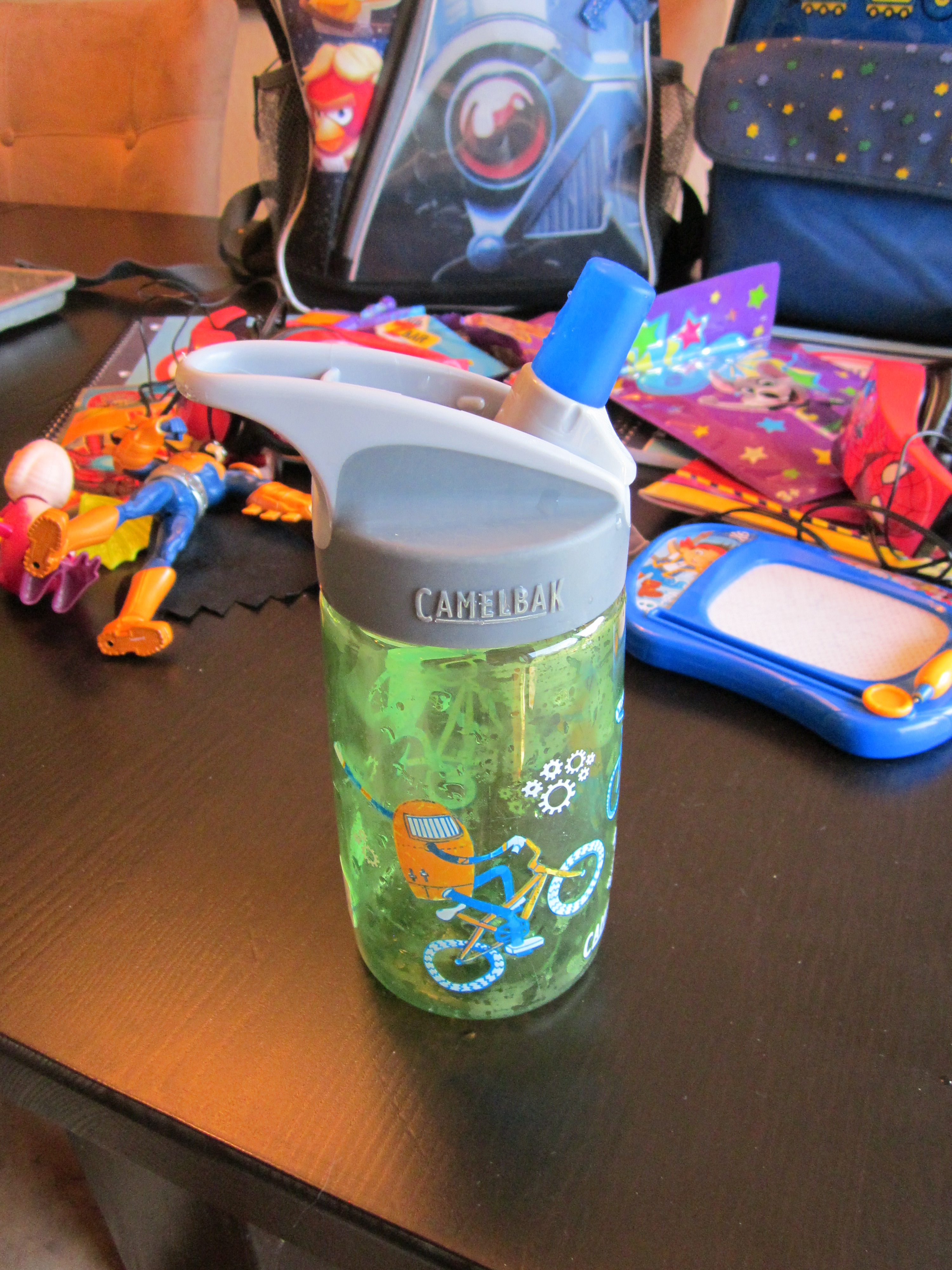 I had also packed a kids Camelbak water bottle for each kid (water on the go and in restaurants is expensive in Europe), empty to get through security and then filled for the plane.  While these water bottles are great for traveling and easy for my kids to use and open and close themselves, they do not work well on planes.  I quickly learned this the first time my son went to take a drink out of his mid flight and it shot out a stream of water all over him due to the air pressure and straw. So I would recommend a water bottle with no straw and a pull up cap or twist on and off top.