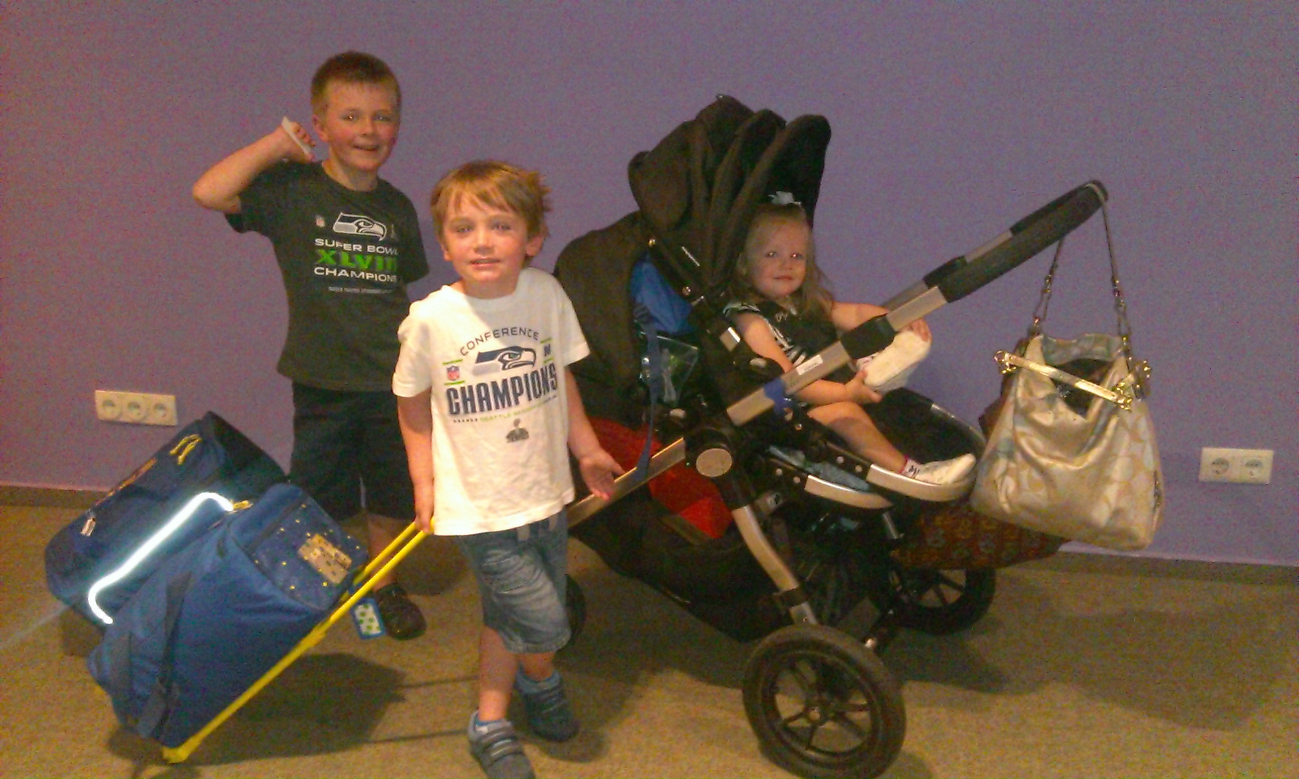 On this trip, we would be going by plane, train and automobile.  I knew the boys had handled their back packs and roller suitcases on the plane and the car before, but when you are going to be traveling by train, you have to consider getting all pieces of luggage on the train and into your compartment along with all kids.  So I needed to be sure that I could manage to transport all the luggage myself with minimal help.  Given my boys’ experience with their own roller suitcases, I knew that they could handle it, so we went with the back pack and roller suitcase combo. The boys’ suitcases could also give me the option of checking or carry on, given their size.  Since I knew we would have access to a washer at some point, we went light with the boys and packed 5 short sleeve shirts, 1 long sleeve, 2 pairs of shorts, 1 pair of pants, 7 pairs of underwear, 5 pairs of socks, 1 pair of tennis shoes and 1 pair of sandals.  Each boy’s suitcase would get their own clothes and shoes and then I planned to fit my clothes and the baby’s in one.  For myself, I chose a suitcase that I knew could fit underneath the stroller that I was going to be taking with me.  It’s much easier to consolidate and push a heavier stroller than try to manage the stroller in one hand, a suitcase in the other, and then an extra arm for navigating the walking kids.  That is why I went with my Baby Jogger City Select (with double stroller attachment) as my choice for this trip.  Even though I knew it would be a little difficult in Paris (a Maclaren works best in Paris), Paris was only 4 days, then I still had 24 other days to lug stuff around.  Here is what we ended up with for luggage for a month in Europe.